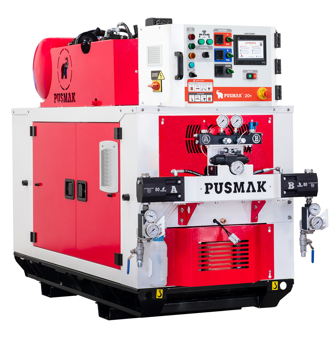 Pusmak’s hydraulically driven genset and compressor integrated spray proportioning machine is engineered and manufactured to fulfill the needs of polyurea coating specialist and spray foam experts. Spray machine is built on a power generator and an air compressor is also integrated to the system. This compact set enables spray constructors to work in areas without 3 phase electricity supply. It can also work with the electricity from the network by passing the generator. With its precise proportioning capacity, it assures contractors with a very well-proportioned mixture of two components.